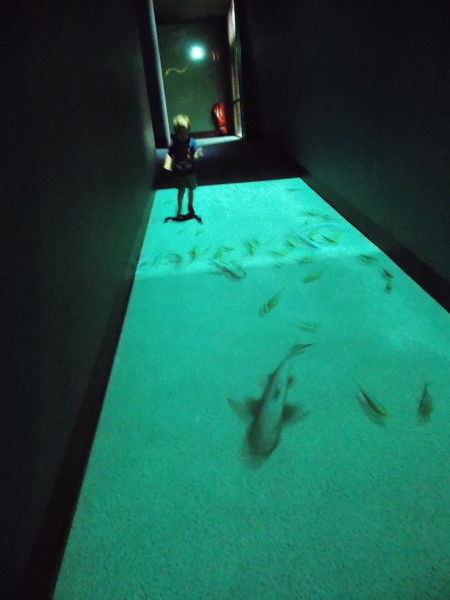 L’entrée à l’aquarium se fait par un ascenseur qui donne l’impression de passer sous l’eau. Cela dure très peu de temps juste assez pour coller un petit frisson à Mouette. L’ascenseur s’ouvre sur un tunnel vitré à 360° où on peut admirer de magnifiques méduses. On est directement dans l’ambiance !
