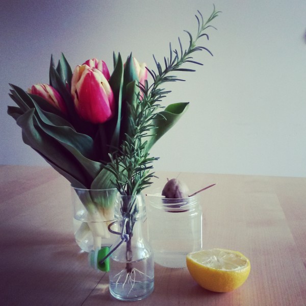 1/ Nature morte. Le petit bouquet qui égaillait la table du dimanche. La bouture de romarin.