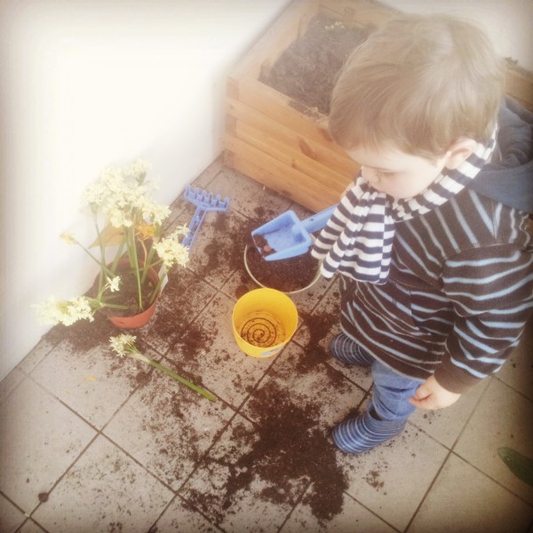 1/ Quand Mouette jardine en même temps que moi il plante les fleurs fânées (et il le fait très bien je trouve)