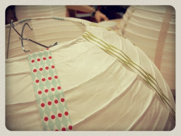 Une fois repus j’ai apprécié mettre les mains dans toutes les jolies choses qui étaient à disposition pour décorer nos lanternes japonaises. Notamment des rouleaux de tissus autocollants, le Daily like, qui nous ont servi à décorer les lanternes. Laury, notre prof, a été très bonne pédagogue la preuve je ne m’en suis pas trop mal sortie au milieu de toutes les blogueuses créatives ! Le Baby est ravi de son lampion. Ca le change de son ampoule nue. Dès qu’il le regarde il dit « é bo » ; la vérité sort de la bouche des enfants…