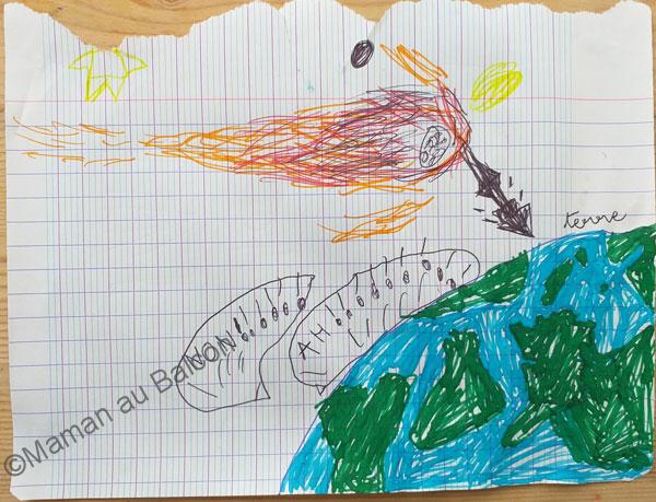 Il avait peur qu’une comète géante percute la terre et tue l’humanité. Oui mesdames et messieurs ! En creusant creusant… on a identifié un reportage qu’il avait vu au JT pendant nos vacances et qui ne nous a pas du tout interpellé. Le reportage disait qu’il y a avait une comète très grosse dont on pensait qu’elle risquait de percuter la terre (avec un risque très élevé de nous tuer tous) mais que finalement en affinant les calculs les scientifiques avaient rassuré tout le monde. Je n’ai plus les dates en tête parce que j’ai du compulser un paquet de sites sur l’espace avant de trouver l’information que Mouette pouvait avoir croisé. Bref Mouette a cru qu’une comète allait dézinguer la terre, forcement ça fait peur. Tout ça a déclenché une grosse vague d’angoisse qui a duré depuis fin aout jusqu’à février. Maintenant on a un retour des cauchemars depuis le confinement. Mais j’ai « mis au point » une technique qui rend les crises de terreurs plus light. Lisez-le et dites moi si ça marche chez vous !
