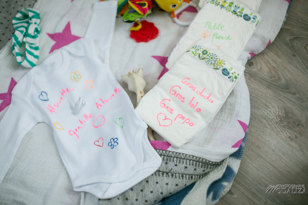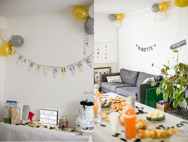 Les filles avaient préparées des activités : customisation de couches et de bodies (j’ai un stock incroyable du coup !), photobooth, arbre à empreintes, bocal à vœux (j’ai hâte de l’ouvrir), paris sur l’heure et la date de naissance d’Alouette mais aussi sur son prénom. Et j’ai l’impression qu’on a pas tout fait, comme le lancé de femme enceinte (#blague) ou essayer de deviner mon tour de ventre.