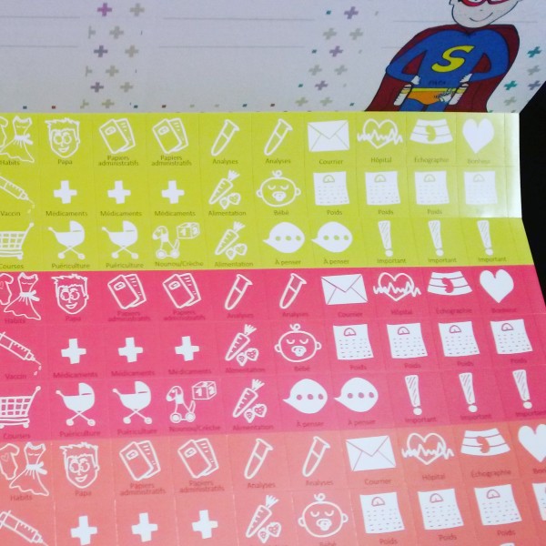 C’est un calendrier perpétuel où l’on inscrit soit-même les dates de début et fin de mois. Il va du 1er mois de la grossesse au 3ème mois du bébé. Chaque mois l’organiseur indique les choses importantes à faire : RDV médicaux obligatoires, joyeuseté administratives… Mais aussi ce qui se passe côté grossesse pour la maman, le bébé et aussi pour le papa. Chacun bénéficie de son petit conseil ! Il y a également des zones à remplir pour ses autres rendez-vous, le résumé de son mois, ce qu’on aime ou pas, son poids… Le tout illustré avec humour et à enrichir de stikers (fournis) ou de photos.