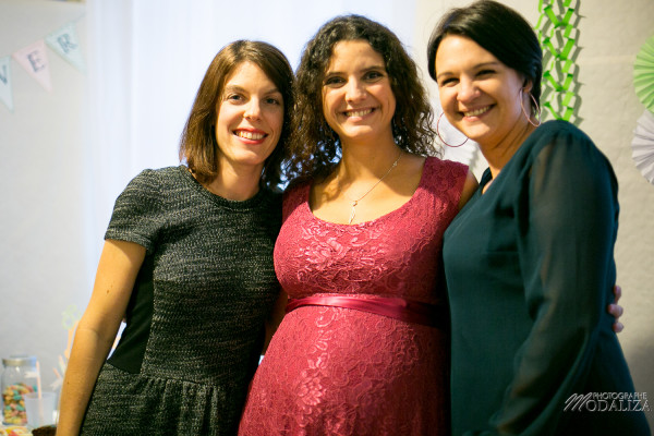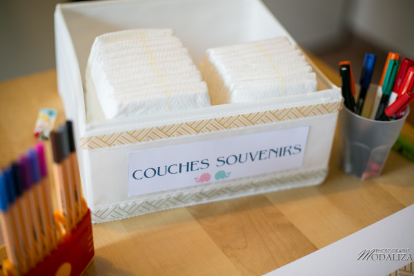 Les animations. Elles doivent tourner autour de la maman et de son futur bébé. Nous avons choisi différentes choses : pronostiquer la date et l’heure de naissance et le sexe du bébé ; découvrir qui sont les copines à travers les photos d’elles bébés, réaliser un arbre à empreintes pour décorer la chambre du bébé, customiser des couches et des bodies, tombola où chaque invité tirait un mois où elle devra offrir un cadeau à Marjolaine et pour finir le photobooth. Nous n’avons pas pu tout faire et notamment le jeu de la mesure du tour de ventre.
