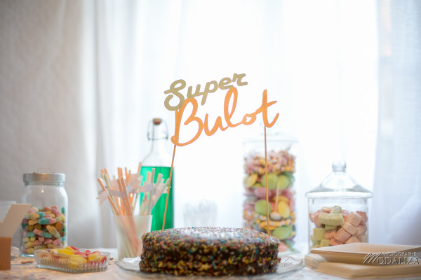 Et enfin la nourriture. Des biscuits sablés délicieux, des bretzels recouverts de chocolat blanc, des bonbons. Et nous avons opté pour un gâteau assez classique sur la forme, en revanche le goût y était. C’est moi qui m’y suis collée et j’ai réalisé un triple layer cake au chocolat amer, avec un insert croustillant praliné et un autre au caramel beurre salé. Le tout recouvert d’une ganache chocolat noir. Pour la déco des paillettes multicolores et un cake topper « Super Bulot ». En boissons nous proposions des sirops aux couleurs du thème + des boissons chaudes. Classique mais efficace. Je pense que tout le monde à mangé à sa faim et c’est là le plus important.