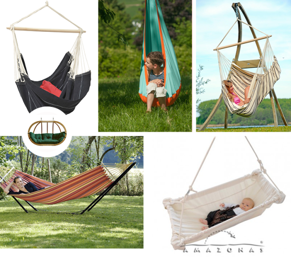 Hamac chaise, Hamac enfant qui va aussi bien à l’intérieur qu’à l’extérieur et peut servir de balançoire, Hamac chaise avec support (pratique quand on a pas d’arbre à proximité), le hamac traditionel et le mini hamac en berceau bébé (ça doit être le kiff total pour les petits ça !).  Dans la bulle le hamac de luxe en rotin qui se rapproche plus de l’esprit balancelle en bien plus sexy quand même.